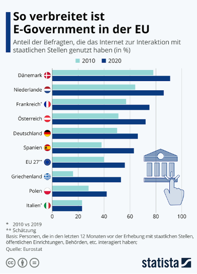 Die Nutzung von E-Government ist in Europa zwischen 2010 und 2020 stark gestiegen. Spitzenreiter sind Dänemark, die Niederlande sowie Frankreich und Österreich, die 2020 bei rund 80–95 % liegen. Deutschland hat sich zwar verbessert (von etwa 40 % auf ca. 60 %), liegt aber im europäischen Vergleich weiterhin im Mittelfeld. Länder wie Spanien und Griechenland holen stark auf, während Italien niedrig bleibt. Insgesamt zeigt sich ein klarer Trend, Digitale Verwaltung wird europaweit immer bedeutender.
